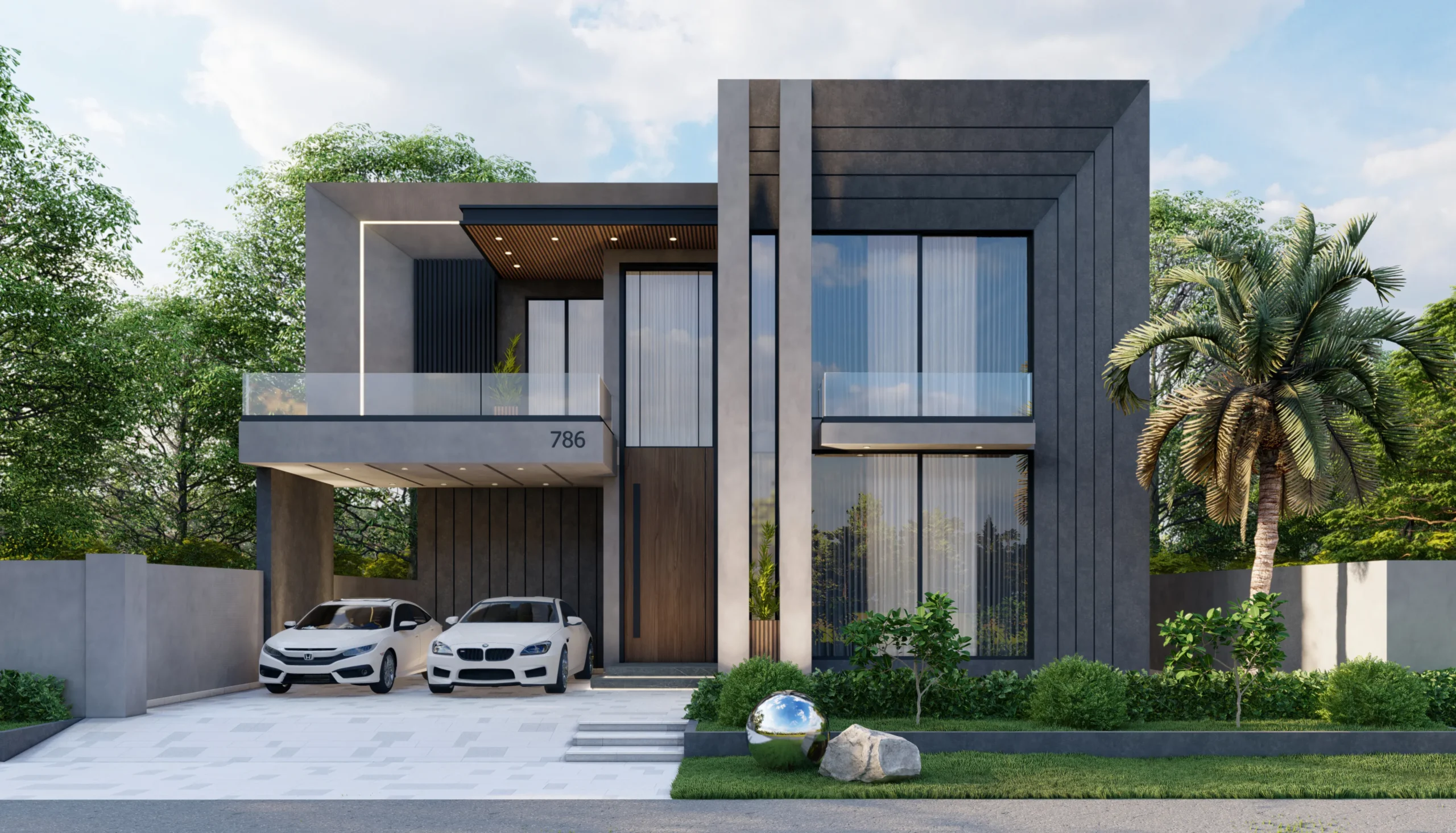 This project highlights the comprehensive execution of a bold Modernist elevation, deeply rooted in crafting a sophisticated and commanding presence.The core objective was seamlessly integrating various textures (concrete, dark cladding, wood) while maintaining a unified, clean geometric look. The main design challenge was ensuring the contemporary form remained elegant and inviting, not stark.
