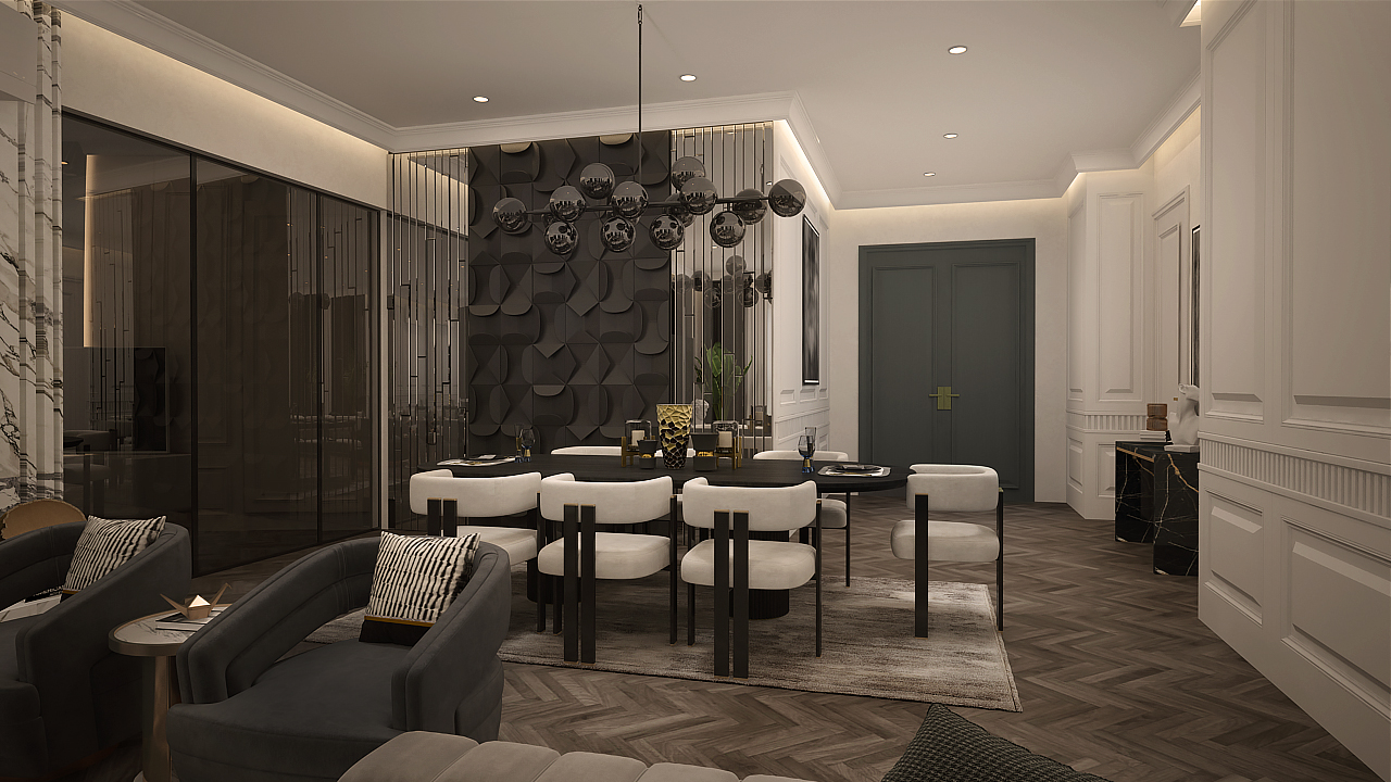 This project highlights the comprehensive execution of a sophisticated open-concept interior, deeply rooted in crafting a refined, contemporary living space.The core objective was seamlessly integrating a luxurious living room with an adjoining dining area using a consistent sophisticated language. The main design challenge was creating a dramatic focal point while maintaining a functional, unified flow.