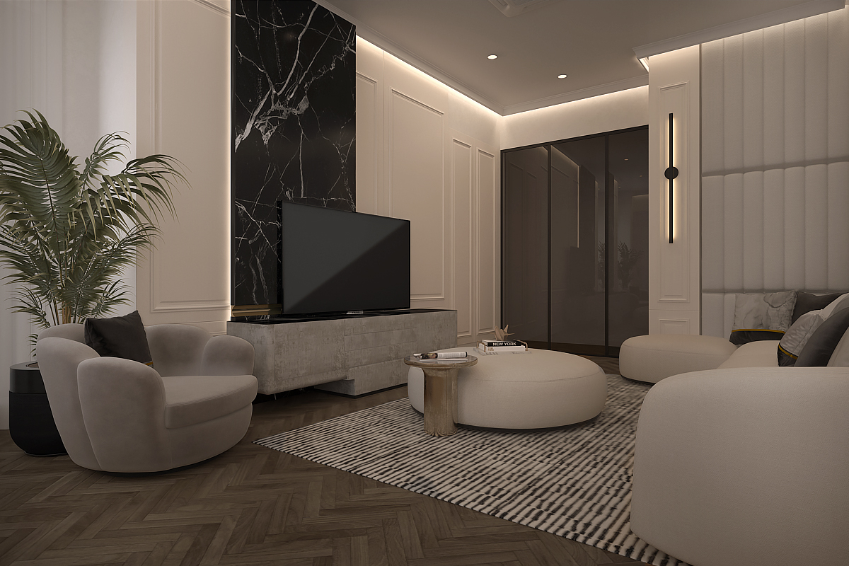 Our design process centers on translating the client’s desire for refined sophistication into a seamless, open-concept reality. We delve into defining the space’s flow and functional purpose, crafting interiors that are both visually elegant and consistently cohesive. We prioritize meticulous execution of a monochromatic palette (neutrals, dark wood), dramatic focal points (marble media wall), and plush, textured seating to deliver an apartment that embodies contemporary luxury and integrated, grand functionality